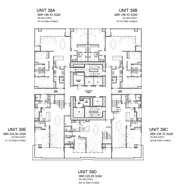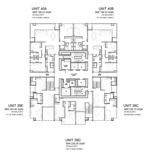 All Three Bedroom units are in the penthouse floors. These units feature 20 sqm balconies and are all north-facing.