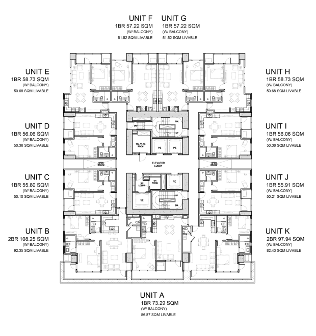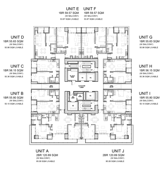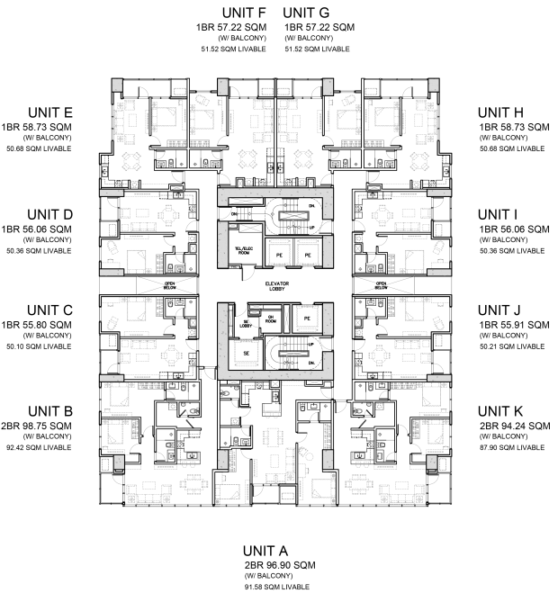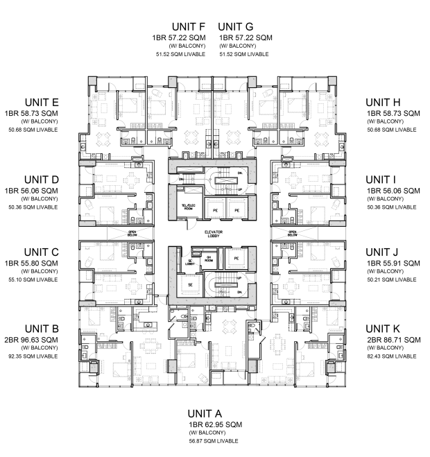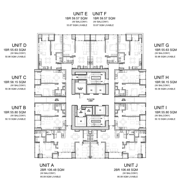 Two Bedroom Units are made for those who have a growing family, or urbanites that need extra space for creative or active pursuits they may have. These units have balconies ranging from 2 to 9 sqm and are at the southern side of the building.